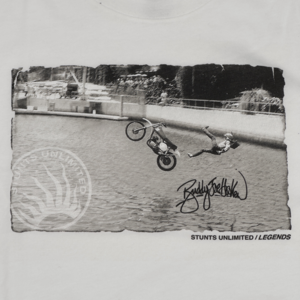 This limited edition tee features a vintage black and white signed print of stunt LEGEND Buddy Joe Hooker in action! Partial proceeds goes to the Taurus World Stunt Awards Foundation for injured stunt performers.