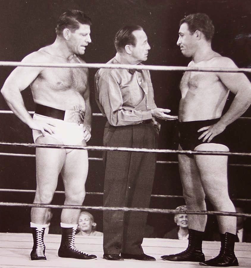 Gene (right) appeared on “The Jack Benny Show” (with Jack playing the referee). On the left is “Count” Billy Varga