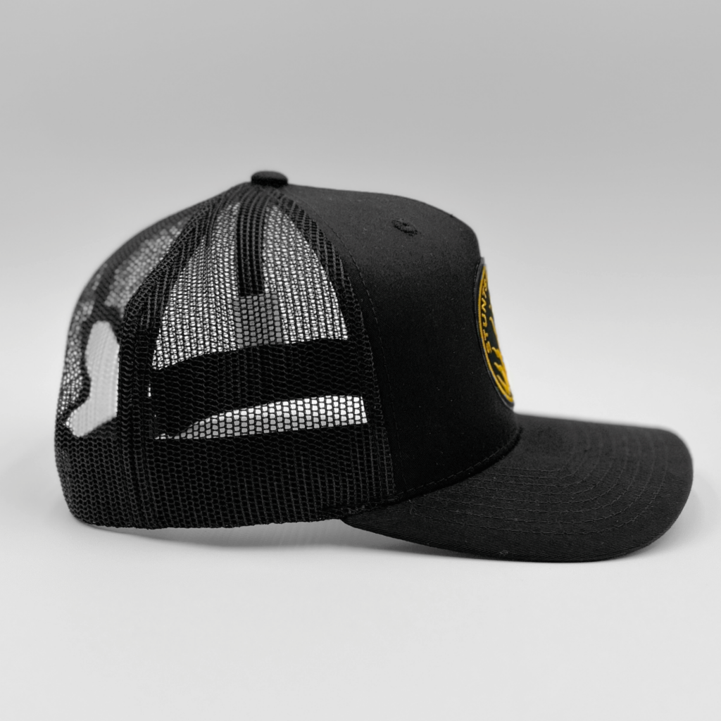 Our 5 panel trucker is adorned with a woven patch of our iconic sun logo, applied via heat transfer to ensure a strong hold.