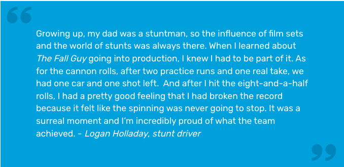 Blockbuster The Fall Guy is action-packed with heart-stopping theatrics including one very special record-breaking stunt. Logan Holladay, the stunt driver for Ryan Gosling’s character achieved the most cannon rolls in a car, with a thrilling 8.5 revolutions!